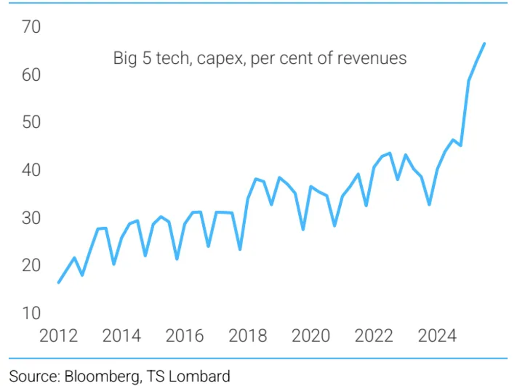 While some narratives suggest AI spending is the only thing keeping the U.S. economy afloat, the reality is more nuanced; AI capex has certainly surged, with Big 5 tech spending as a percentage of revenue hitting record highs in 2025. Big Tech’s capex binge cushioned the economy in 2025, propping up the top of the K while the bottom struggled.