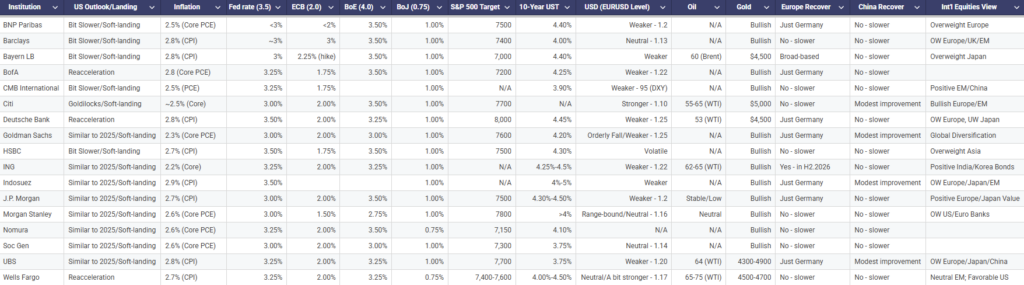 - The S&P 500: Most banks, from Goldman to JPM, are clustered around a target of 7500–7600, predicting another year of modest, “comfortable” returns.
