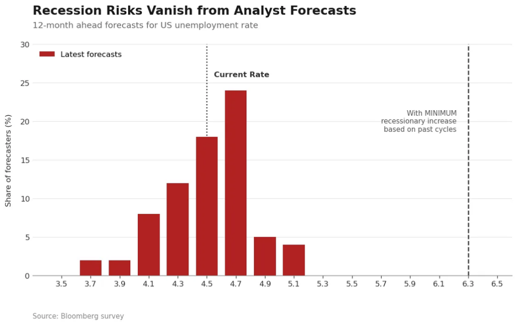 After getting it wrong so many times (the 2023 outlook was particularly embarrassing), economists have officially lost their nerve. They’ve stopped believing a recession is even possible. Look at the Bloomberg survey of unemployment forecasts: you’ll see a herd mentality where virtually nobody dares to predict a rise in the jobless rate of more than 40bps.