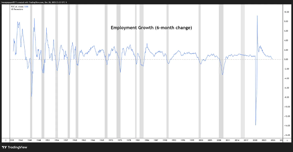 Superstition aside, the U.S. labor market is flashing some genuine yellow lights. The six-month change in payrolls is currently trending toward zero and very close to be negative – a move that has almost never happened outside of a recession. Usually, when this metric dips below the zero line, a plunge follows. Once the labor market actually cracks, it triggers a toxic feedback loop: weaker spending → falling profits → more layoffs.
