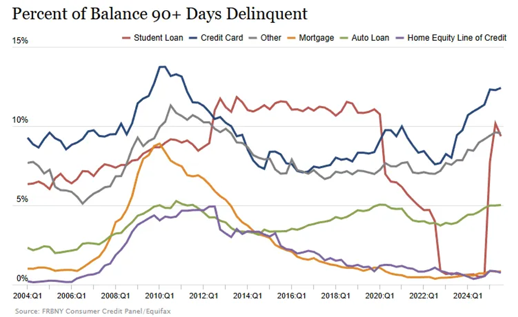 - Default rates are indeed rising in subprime auto, student debt, and parts of the mortgage market.