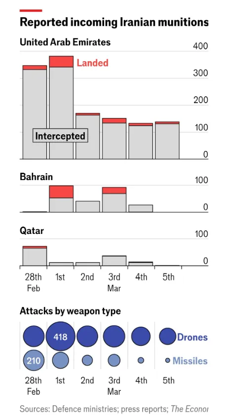 The data backs the market’s calm. Iranian offensive capability has been severely degraded. The volume of munitions being launched has fallen sharply. The interception rate has risen precipitously. And crucially, Iran has shifted from missiles to drones — a downgrade in destructive capability, not an upgrade. A drone attack is noise. A ballistic missile is a different matter. Iran is running out of the latter.