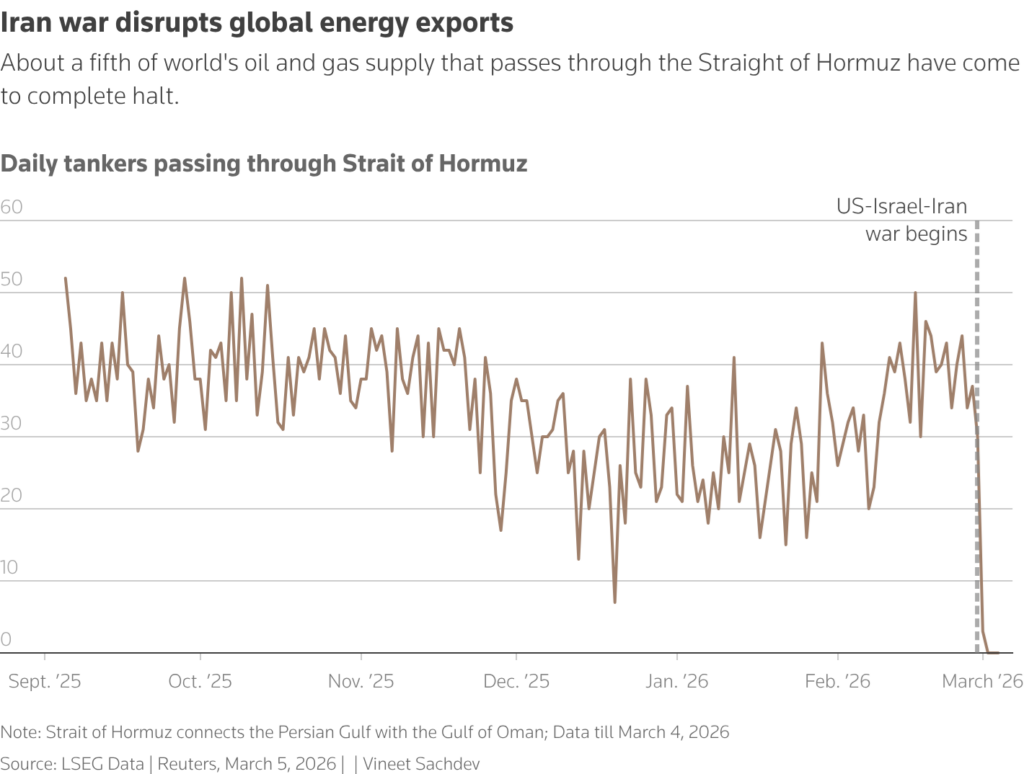 Twenty percent of global crude oil transits through the Strait of Hormuz. Roughly 90% of Persian Gulf oil flows to Asia. One disruption to that corridor and you’re not just repricing oil — you’re repricing the entire Asian economy.