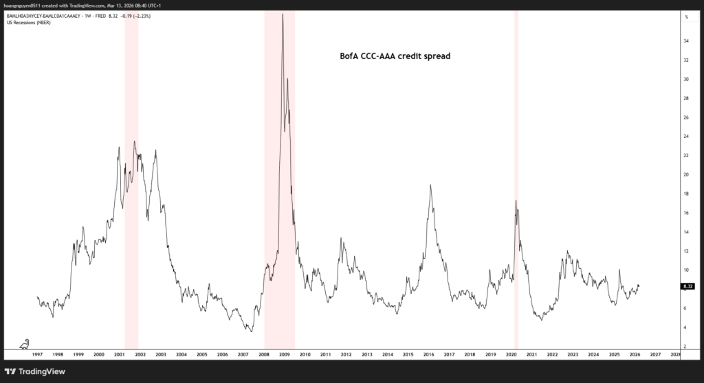 The concern is that the current oil spike recreates that exact sequence. Oil forces rates higher. Higher rates expose every over-leveraged institution in a financial system that has been running on near-zero rates for fifteen years. Credit spreads blow out. What starts as an energy disruption becomes a credit crisis. A deflationary crash follows.
