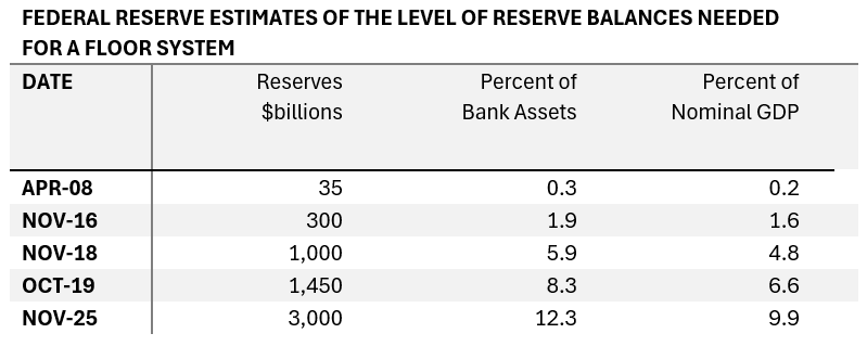 Khái niệm “dự trữ dồi dào” đã liên tục được điều chỉnh theo một hướng: tăng lên. Theo phân tích của Bill Nelson, ước tính về mức thanh khoản “đủ” của Fed đã liên tục tăng qua các năm.